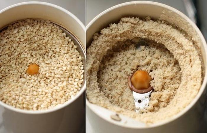 2Кунжут измельчаем в кофемолке или растираем в ступке.