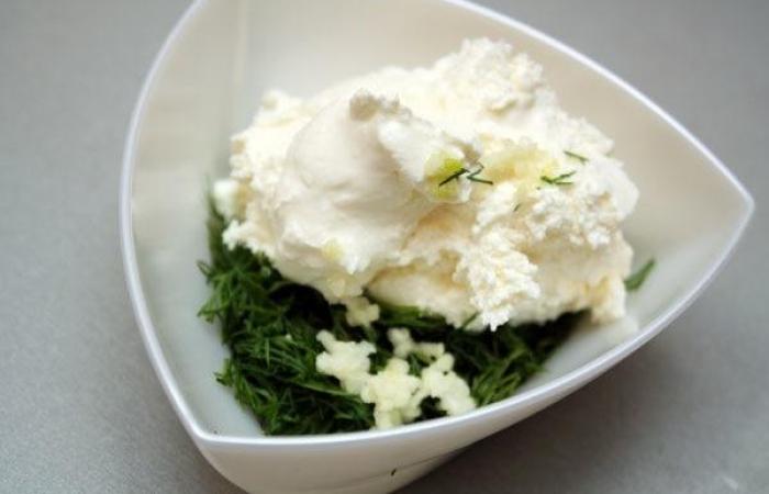 4Смешиваем сыр с рубленым укропом и измельченным чесноком. В отдельной емкости раздавливаем авокадо с помощью вилки и смешиваем с лимонным соком.