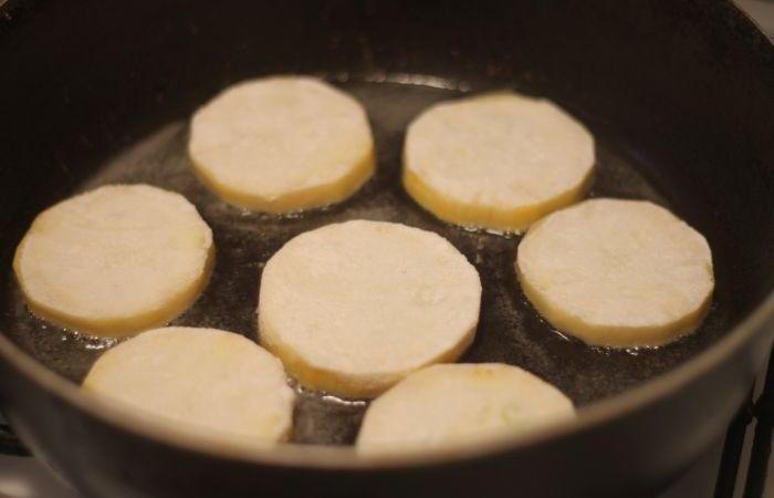 4Обжариваем кабачки на сковороде на медленном огне около 7 минут с каждой стороны.