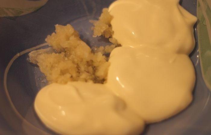 6Тем временем готовим начинку. Смешиваем майонез с пропущенным через пресс чесноком.