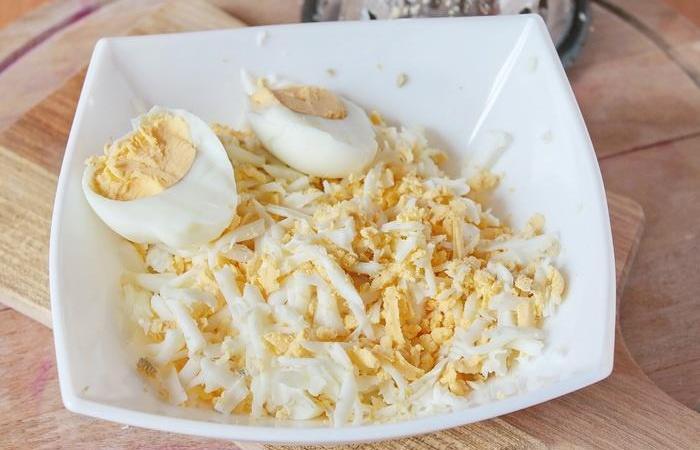 2Яйца трем на крупной терке. Желток одного яйца оставляем для украшения.