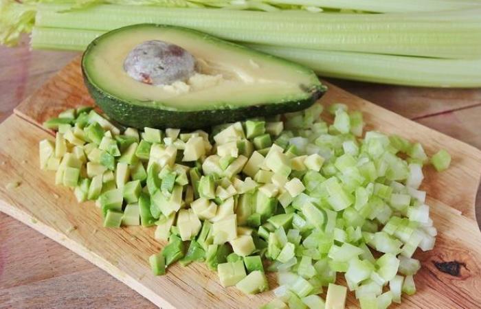 3Авокадо разрезаем пополам и удаляем косточку. Аккуратно вырезаем мякоть острым ножом и нарезаем ее мелкими кубиками. Сельдерей также нарезаем мелкими кубиками.