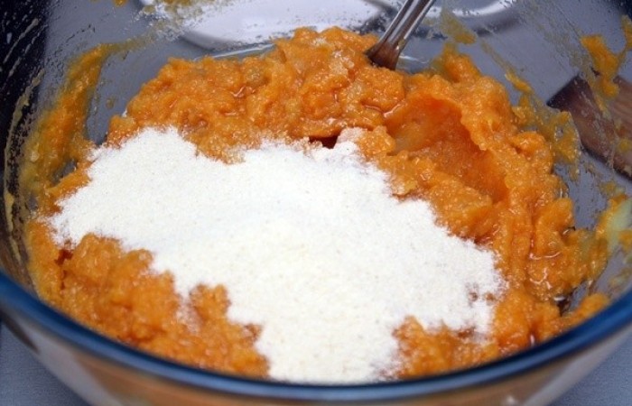 3Тыкву с картофелем разминаем в пюре и добавляем муку, соль и две столовые ложки масла. Перемешиваем все ингредиенты до однородности.