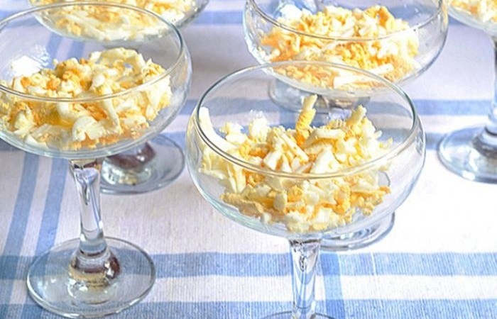 4По креманкам слоями выкладываем яйца, огурцы и майонез.
