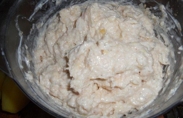 2В чашу блендера выкладываем нарезанное кусочками филе и чеснок. Добавляем соль, специи, белок и сливки.