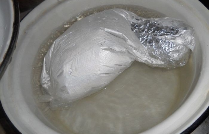 4Получившуюся массу выкладываем на фольгу, заворачиваем и формируем колбаску, закручивая края. Кладем завернутую в фольгу колбаску в пакет, завязываем и варим в течение получаса.