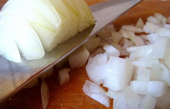 2Лук очищаем от шелухи и нарезаем небольшими кубиками.