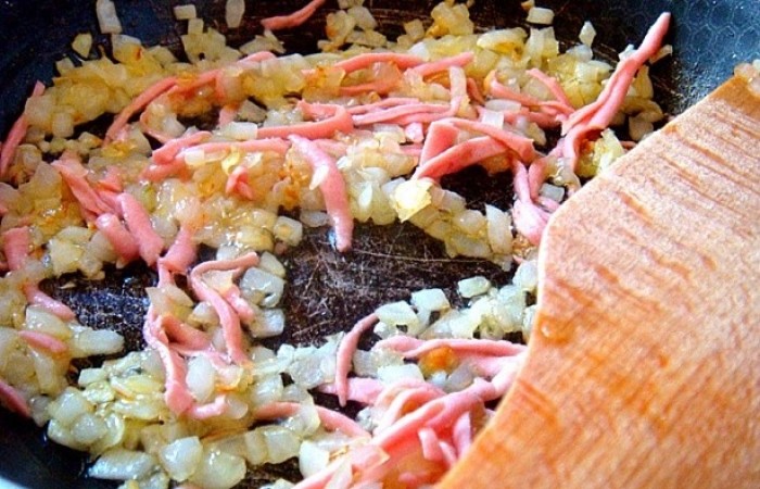 6Готовим начинку. Лук обжариваем до золотистой корочки на растительном масле в течение 4-5 минут, а затем добавляем ломтики ветчины и жарим еще 2 минуты. Солим, перчим.