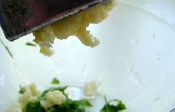 7Готовим соус. Чеснок пвыдавливаем через чеснокодавку, солим, перчим, добавляем сметану и рубленую зелень.