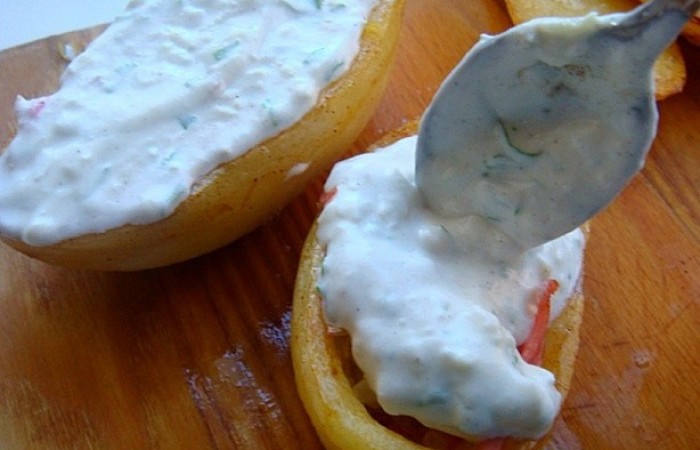 9Каждый картофельный сундучок наполняем начинкой, а сверху заливаем соусом.