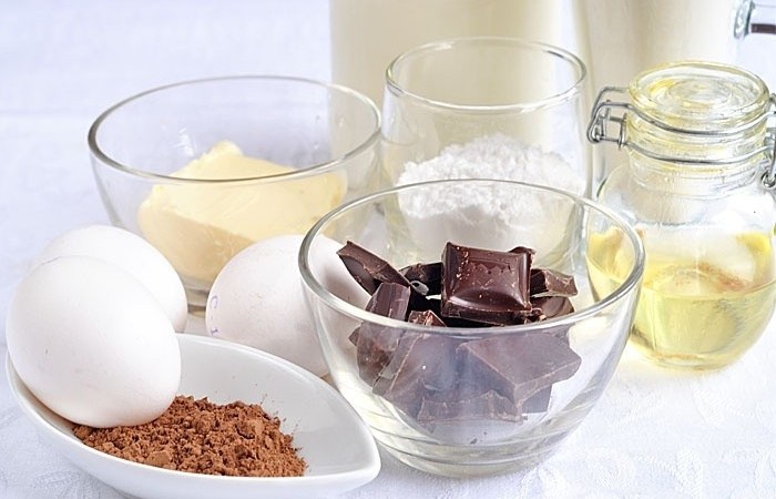 2Готовим тесто. Масло с шоколадом нарезаем кубиками и растапливаем. Можно использовать микроволновую печь. Половину молока тоже разогреваем, доведя до температуры шоколадной смеси, перемешиваем с остальными ингредиентами и отставляем в сторону.
