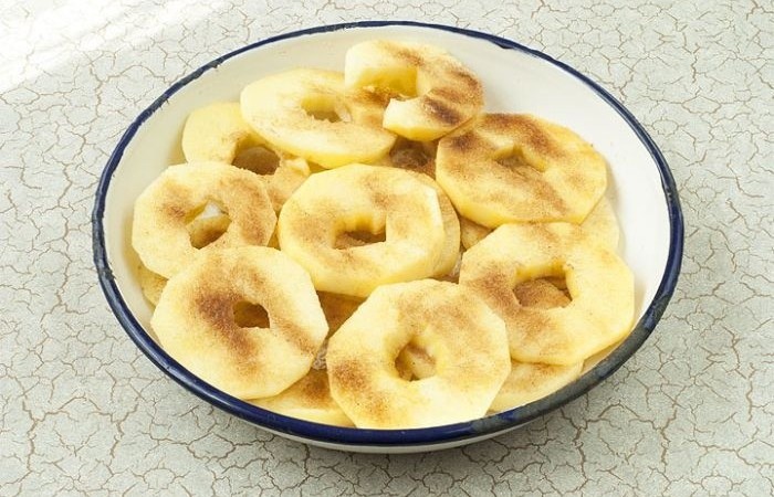 2Яблоки очищаем от кожуры и сердцевины. Нарезаем кружочками и посыпаем сахаром и корицей. Поливаем ромом и даем настояться полчаса.
