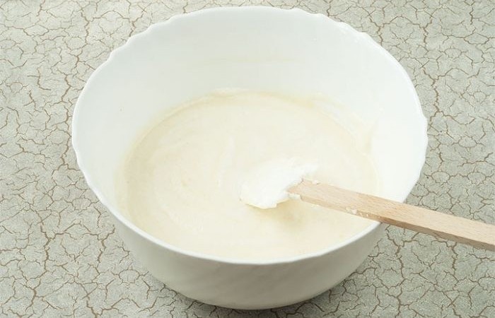 4В миске смешиваем муку, разрыхлитель, желтки, 2 ст.л. масла и соль. Размешиваем и добавляем пиво. При необходимости добавляем больше пива, если тесто получается очень густым.