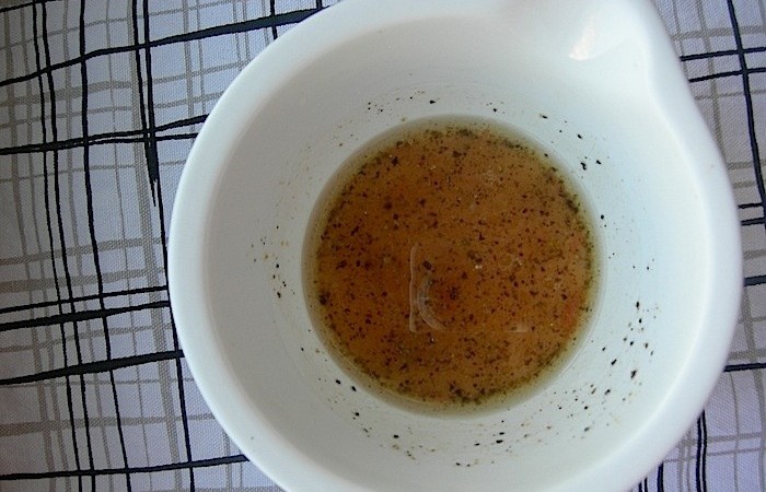 4Готовим заправку. В ступке разминаем черный перец и добавляем масло, сок грейпфрута и соль. Тщательно все перемешиваем.