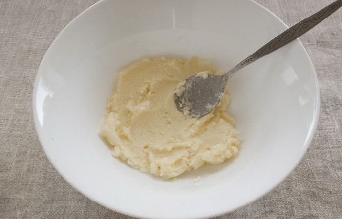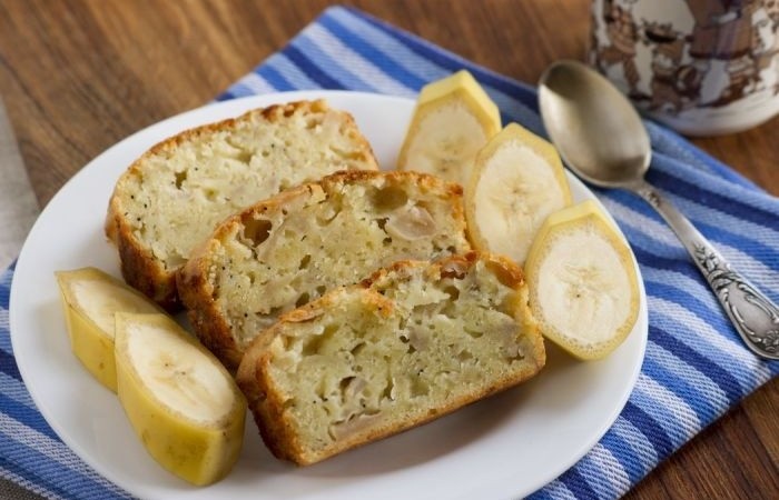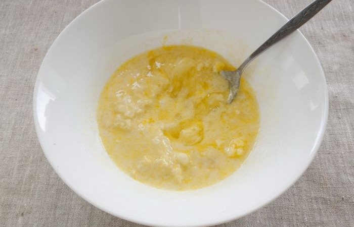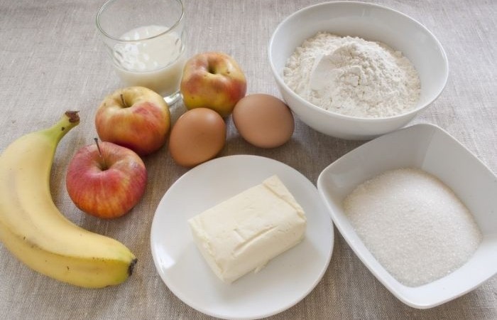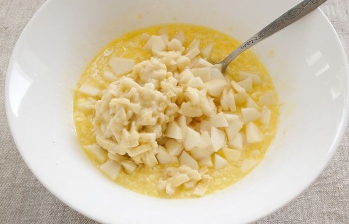 4Добавляем очищенные и нарезанные кубиками яблоки. Также добавляем мякоть банана, размятую вилкой.