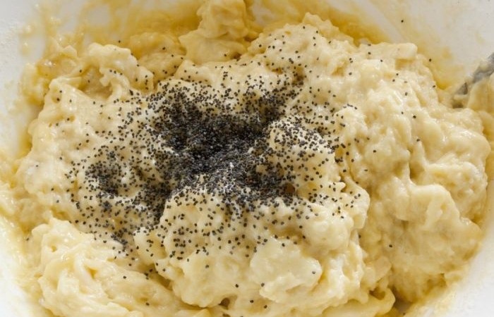 5Перемешиваем и добавляем постепенно муку с разрыхлителем. Перемешиваем и добавляем мак.