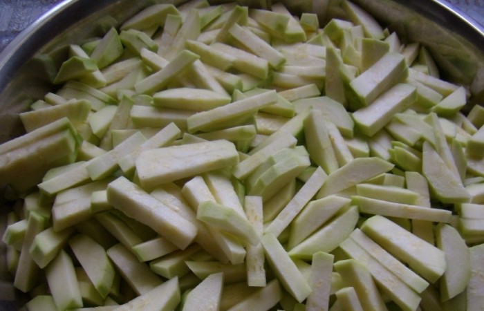 2Нарезаем кабачки соломкой толщиной примерно один сантиметр.