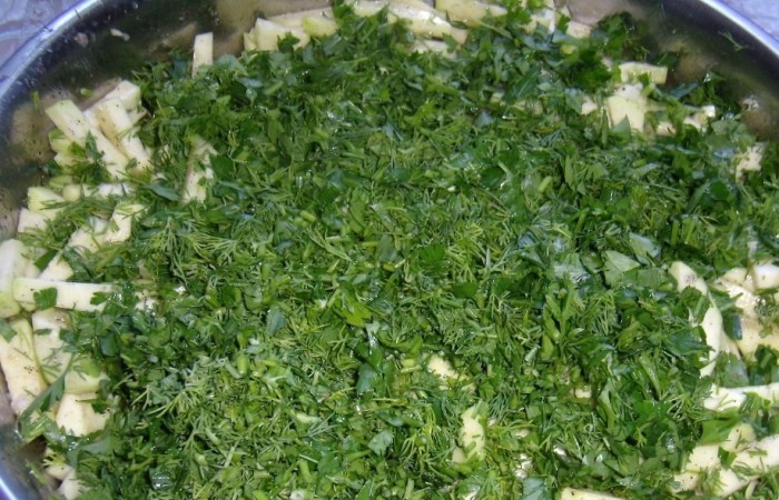 4Затем добавляем измельченную зелень и снова перемешиваем.