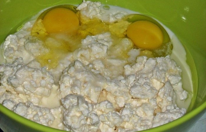 2В миске смешиваем творог, яйца, молоко, разрыхлитель, масло и соль.