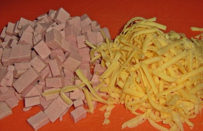 3Сыр трем на крупной терке, а колбасу нарезаем мелкими кубиками.