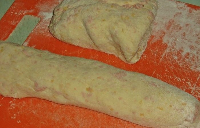 4В яично-творожную смесь добавляем колбасу с сыром и перемешиваем. Затем добавляем муку и замешиваем однородное тесто. Формируем из теста колбаску.