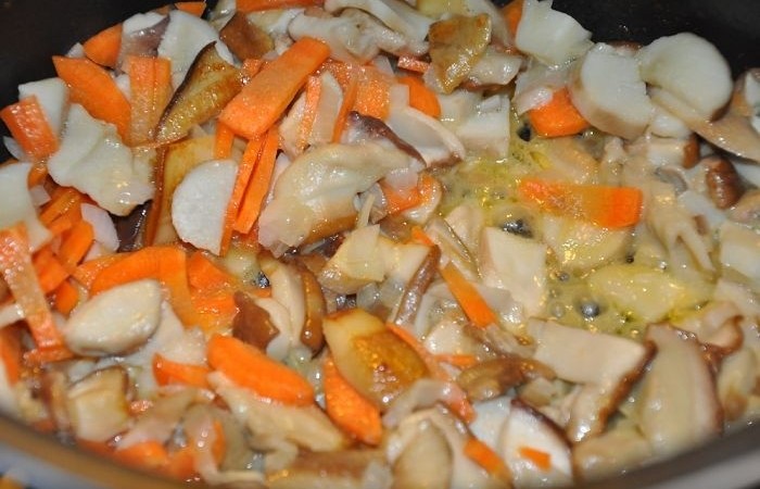 2Нарезаем грибы небольшими кубиками и выкладываем в толстостенную кастрюлю или сотейник. Обжариваем на сливочном масле в течение 5 минут.