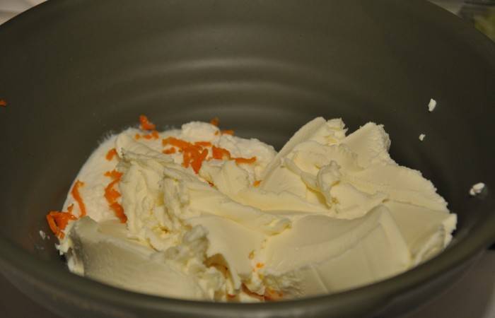1В емкость выкладываем рикотту, маскарпоне и апельсиновую цедру. Тщательно перемешиваем.