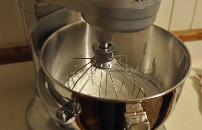 2С помощью миксера взбиваем яичные белки с солью. Постепенно добавляя половину сахара продолжаем взбивать.