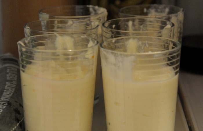 3Получившуюся смесь смешиваем с рикоттой и маскарпоне и раскладываем по стаканам.