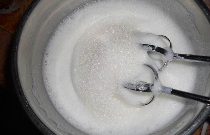 3Взбиваем белки с помощью миксера и добавляем сахар. Продолжаем взбивать дл стойких пиков.