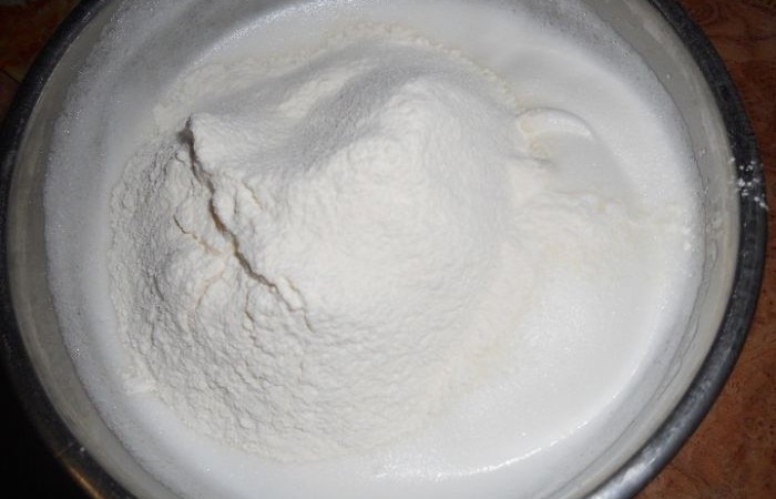 4Постоянно помешиваем добавляем постепенно муку. Перемешиваем аккуратно смесь.
