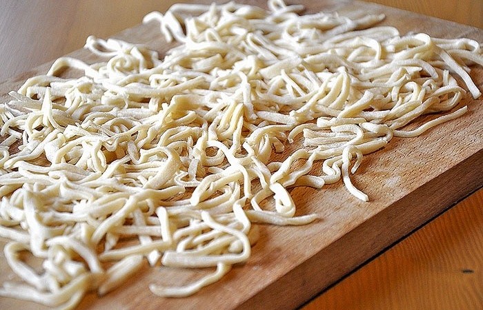 3Готовим лапшу. В миску насыпаем муку, делаем углубление и вливаем яйцо. Солим и замешиваем тесто. Раскатываем тесто и нарезаем полосочки.