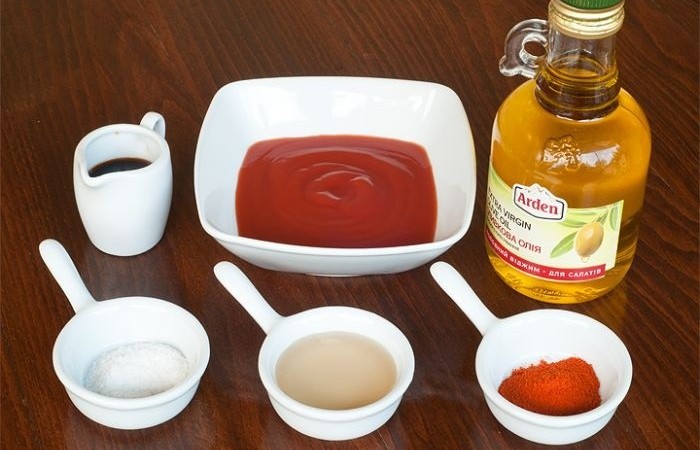 2Подготавливаем ингредиенты для маринада (соевый соус, мед, томатный соус, соль, паприка, масло). Тщательно все перемешиваем.
