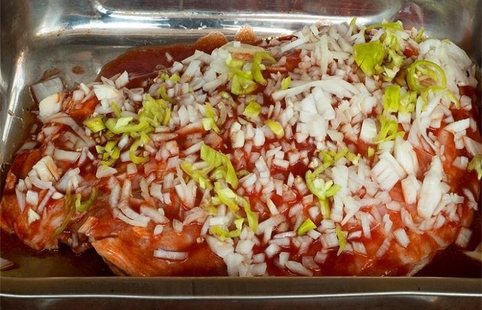 3Ребра тщательно смазываем маринадом и выкладываем в емкость. Сверху посыпаем измельченным луком с острым перцем и оставляем на час. Через час переворачиваем ребра и оставляем еще на 40 минут.