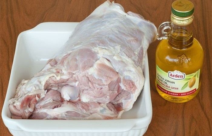 1Подготавливаем баранину. Тщательно промываем ногу и обсушиваем. Удаляем лопаточную кость и оставляем мякоть с одной косточкой. Обжариваем баранину со всех сторон до золотистой корочки.