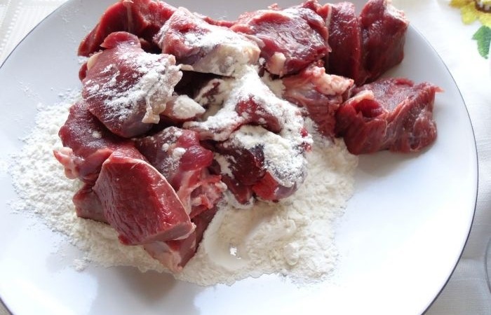 3Говядину нарезаем небольшими квадратиками и панируем в муке.