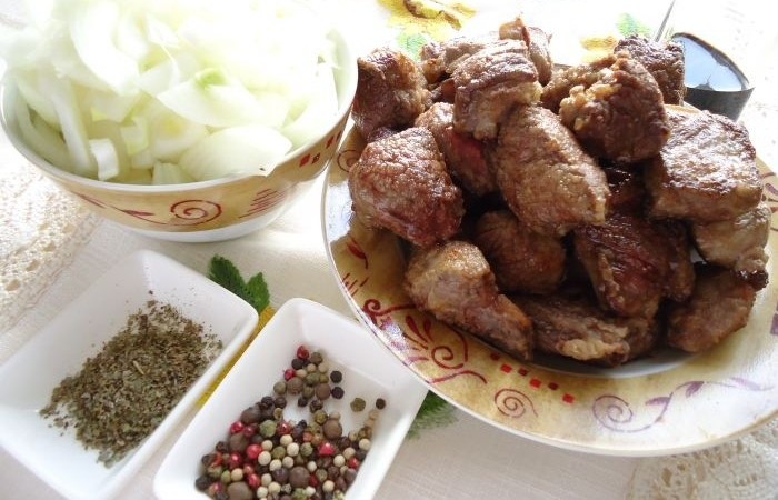 4Обжариваем мясо порционно на сковороде, где обжаривались чеснок с перцем до румяной корочки и выкладываем на тарелку.