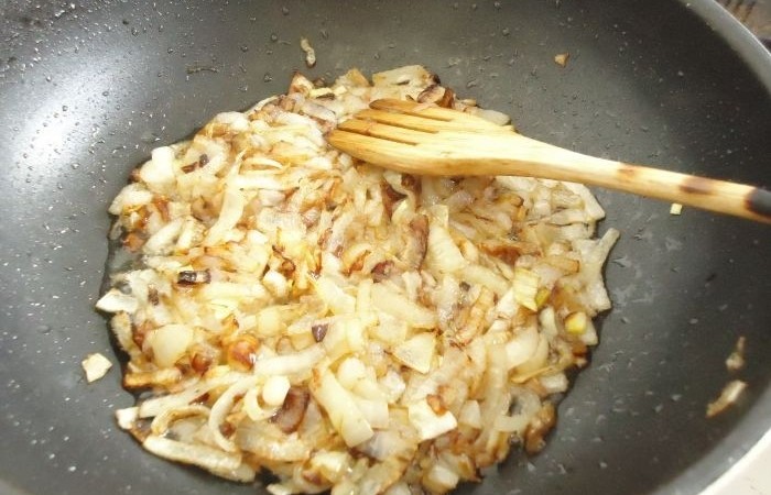 5Обжариваем нарезанный мелкими кубиками лук до золотистости.