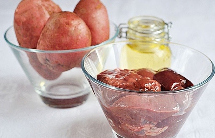 1Подготавливаем необходимые ингредиенты для блюда. Печень заранее вымачиваем в воде (можно в молоке), а затем промываем и нарезаем порционными кусочками.
