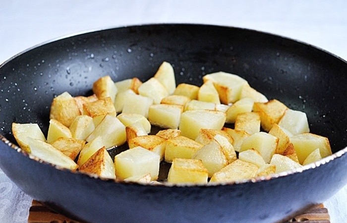 2Картофель нарезаем небольшими кубиками и обжариваем на масле до золотистой корочки. Солим, перчим.