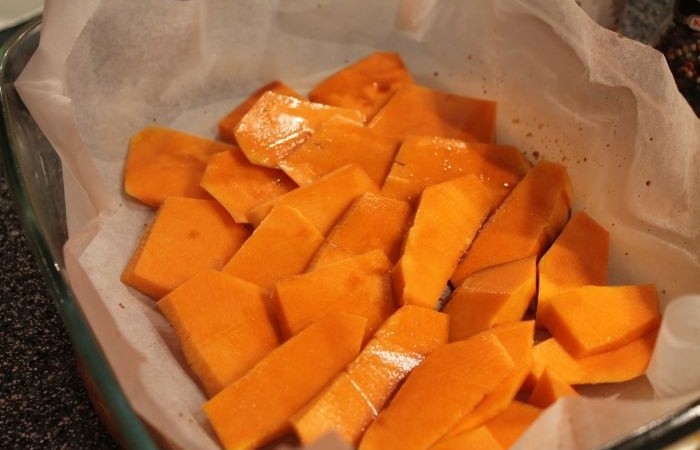2Тыкву нарезаем небольшими кусочками и выкладываем в форму для запекания, застеленную пергаментом. Солим, перчим и поливаем бальзамическим уксусом.