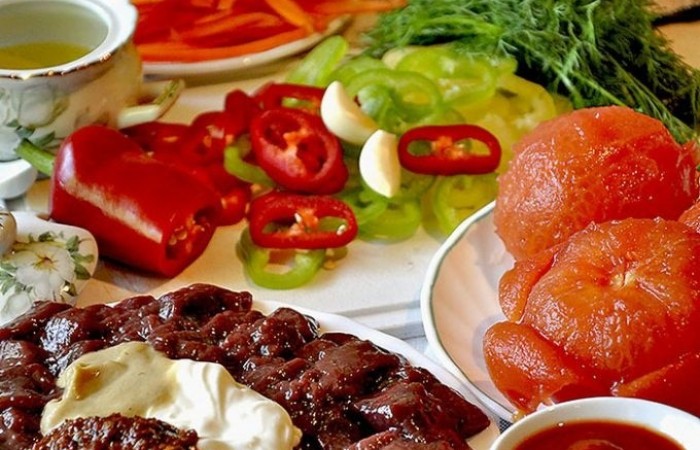 2Печень перемешиваем с горчицей, аджикой и сметаной. Морковь нарезаем брусочками, перец кольцами, лук полукольцами, а с помидор снимаем кожуры, предварительно обдав их кипятком.