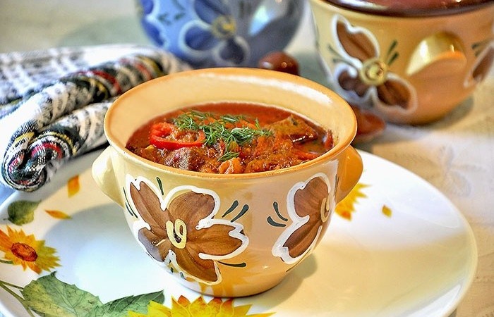 3Обжариваем на медленном огне печень, затем выкладываем морковь с луком, перцем и помидорами. Солим, перчим и добавляем измельченный чеснок. Добавляем томатный соус и тушим в течение 7-8 минут, периодически помешивая. Раскладываем обжаренные ингредиенты по горшочкам, вливаем бульон и отправляем в духовку на 1,5 часа, предварительно разогретую до 180 градусов.