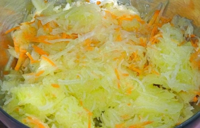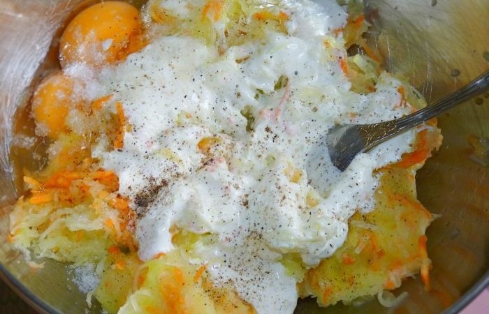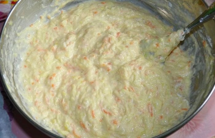 2Кабачки с морковью трем на крупной терке и оставляем на 10 минут, чтобы слить жидкость.