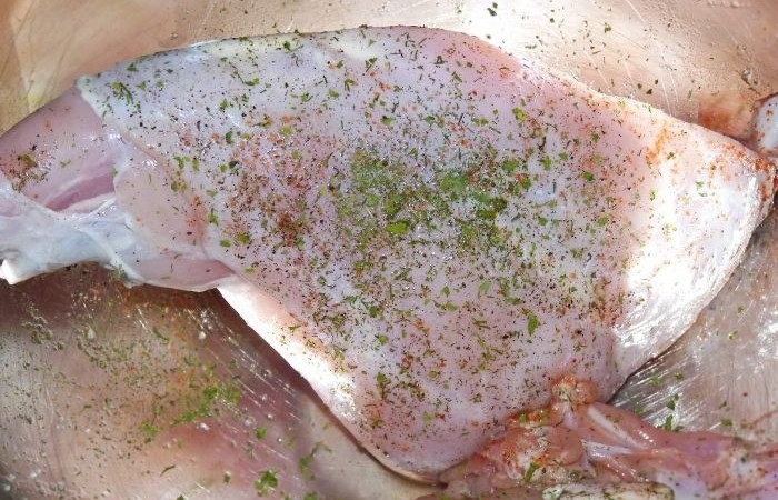2Кролика солим, перчим и посыпаем сушеной зеленью.