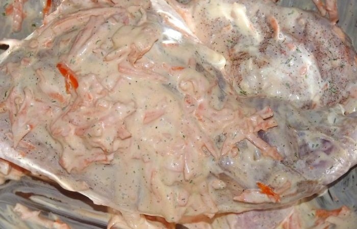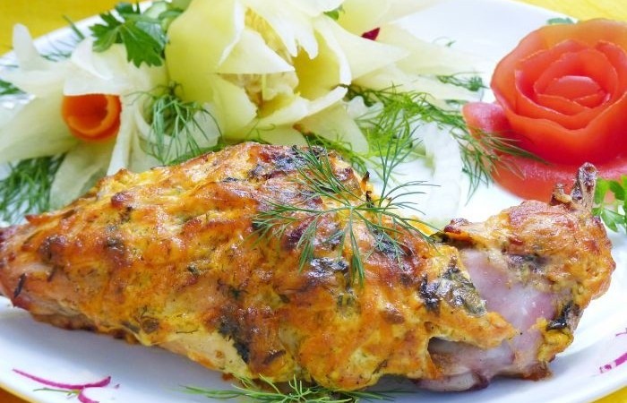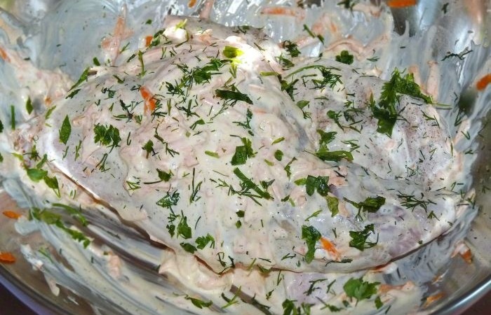 4Укроп с петрушкой рубим мелко и посыпаем кролика. Оставляем мариноваться примерно на час.