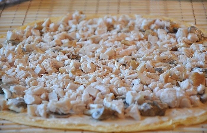 Как приготовить Рулет "Праздничный" с копченой курицей и шампиньонами - пошаговое описание