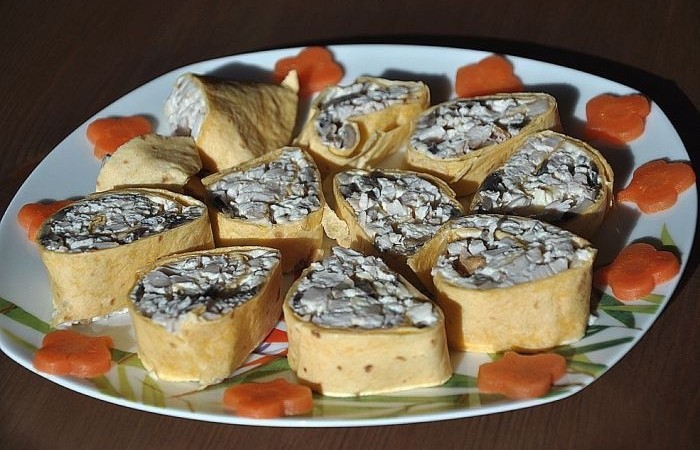 В данном рецепте представлена замечательная закуска из лаваша - рулет "Праздничный" с копченой курицей и шампиньонами. Готовится рулетик просто, быстро, а выглядит достойно и по-настоящему празднично!
