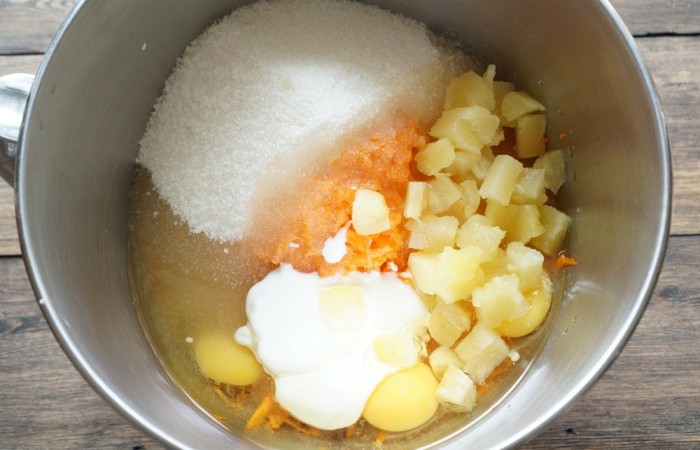 4Добавляем растительное масло, йогурт, сахар и мелко нарезанный ананас.
