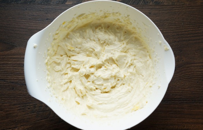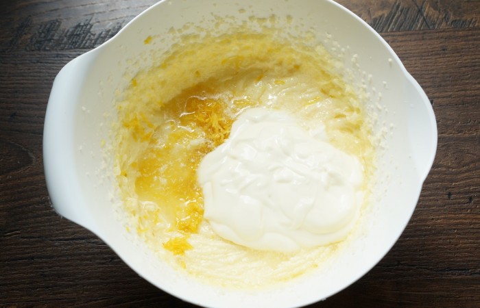6Затем добавляем йогурт, лимонную цедру и сок. Перемешиваем.